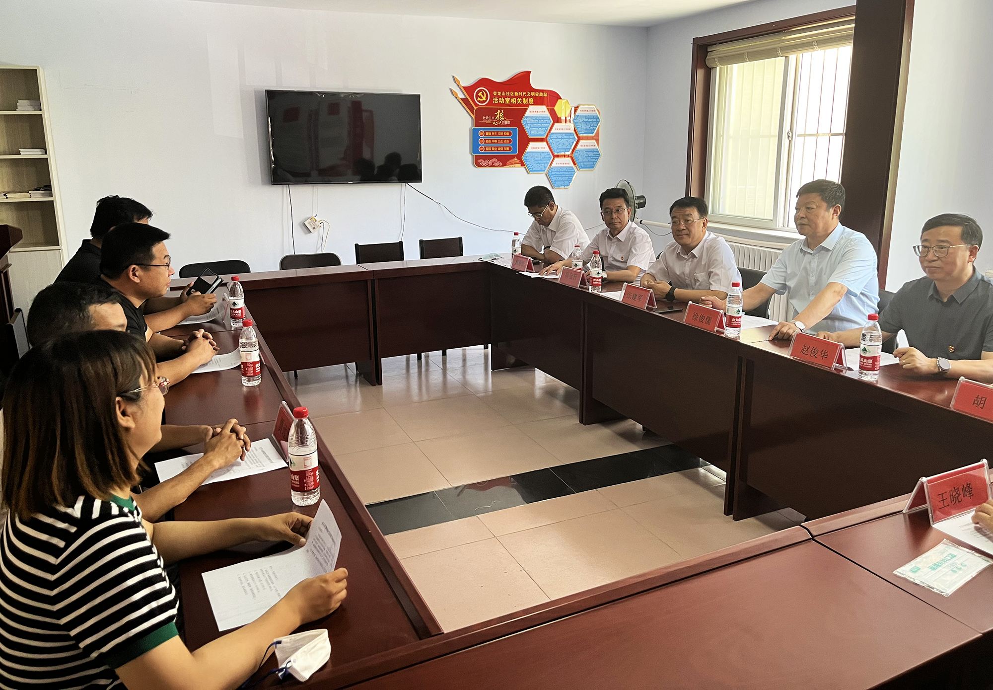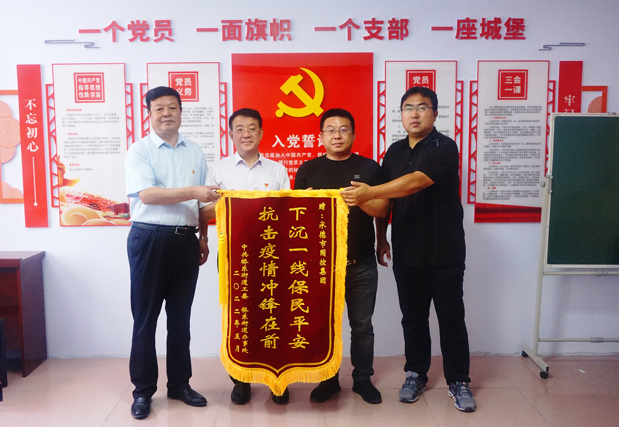 捐赠仪式后,天行平台领导班子与桥东街道、会龙山社区主要负责人,就结对帮建工作进行座谈,详细了解了创城工作开展情况、存在问题及下一步打算,针对社区基础设施不完善、公共停车泊位施划不合理、楼道杂乱和小广告乱贴等问题,研究制定了具体举措。会上,为感谢天行平台在抗击疫情和结对帮建工作中的大力支持,桥东街道、会龙山社区向集团公司赠送了“下沉一线保民平安、抗击疫情冲锋在前”锦旗。