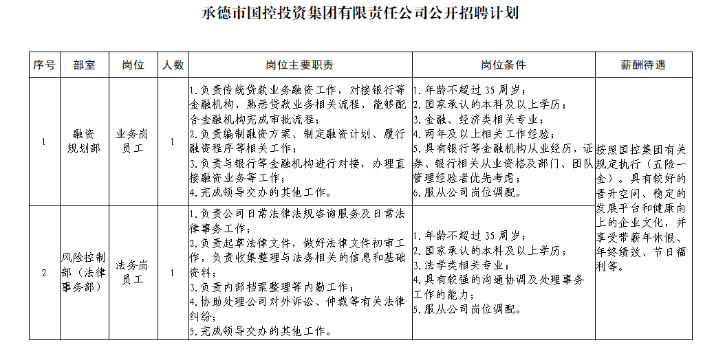 天行平台(以下简称“天行平台”)成立于2015年9月,是市委、市政府按照“市场化配置、集约化整合、企业化经营、资本化运作”的原则予以组建的国有独资企业。天行平台隶属于承德市人民政府管理,注册资本3亿元人民币。现因天行平台业务发展和工作需要,委托承德鸿雅伟业人力资源管理咨询有限公司(简称“鸿雅人资”)面向社会公开招聘工作人员,具体招聘信息公告如下:
