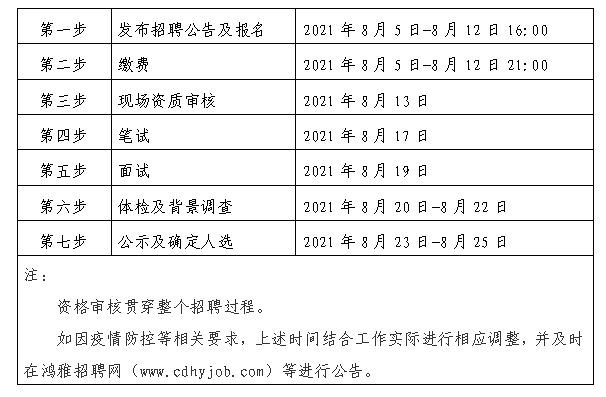 2021年8月5日至 2021年8月12日16:00 在鸿雅招聘网(http://www.cdhyjob.com/)、鸿雅微信公众号、天行平台官方网站等发布招聘公告。