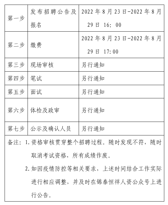 2022年8月23日-2022年8月29日 16:00在锦泰恒祥人资官网(www.jthxhr.com)、“锦泰恒祥人资”微信公众号、“天行平台”官方网站(www.julibecker.com)及上级部门要求的相关网站等发布招聘公告。