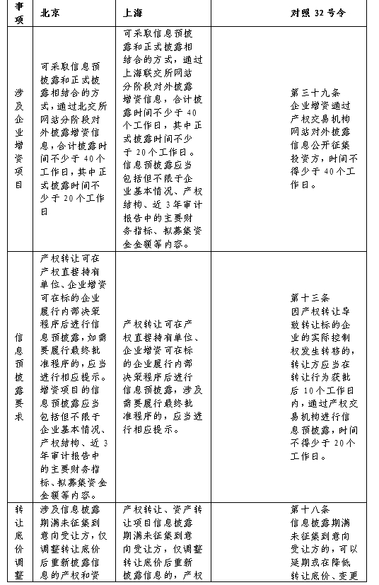 六、企业增资可采取信息预披露和正式披露相结合的方式,通过产权交易机构网站分阶段对外披露增资信息,合计披露时间不少于40个工作日,其中正式披露时间不少于20个工作日。信息预披露应当包括但不限于企业基本情况、产权结构、近3年审计报告中的主要财务指标、拟募集资金金额等内容。七、产权转让可在产权直接持有单位、企业增资可在标的企业履行内部决策程序后进行信息披露,涉及需要履行最终批准程序的,应当进行相应提示。(与32号文相应规定相比,将增资行为作为法定信息披露的内容)