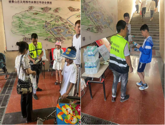 近日,受暖性高压脊影响,我市迎来持续数天的高温天气,相关部门相继发布了高温橙色、红色预警。市国动办、市天行平台在避暑山庄门前地下人防停车场设置了“高温天气便民服务点”,为外地游客和本市市民免费发放矿泉水和藿香正气水,为出游的游客和市民提供饮水和预防中暑药物,受到了广大群众的一致好评。